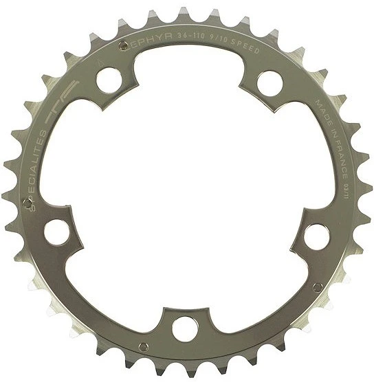 Spezifikationen:Einsatzbereich:RoadBefestigung:110 mm Lochkreis, 5-ArmZähne:34 Z, 36 Z, 38 Z, 39 Z, 40 Z, 42 ZSchaltstufen:3×9-fach, 3×10-fachTechnische Daten:Material:Aluminium (7075-T6)Kompatibilität:für Road Compact Kurbeln (110 mm Lochkreis)auch für MTB Kurbeln vor 1993 mit 110 mm Lochkreis und Lochabstand 65 mm (alter Shimano MTB-Standard)Position: MitteFeatures:Lochabstand 65 mmschwarz oder silbern eloxiertdesignt und hergestellt in Frankreich